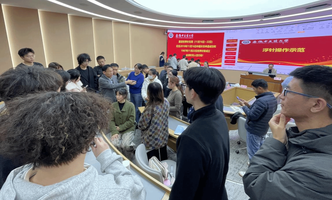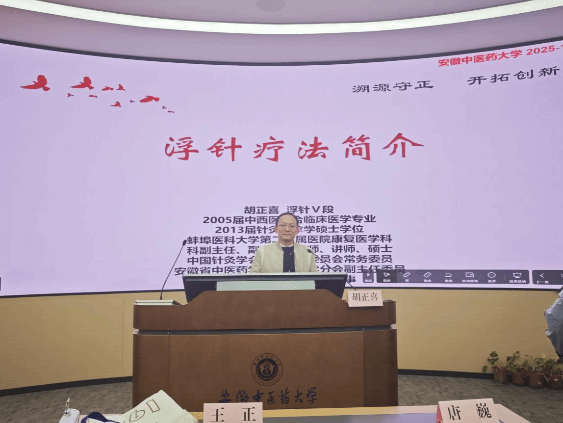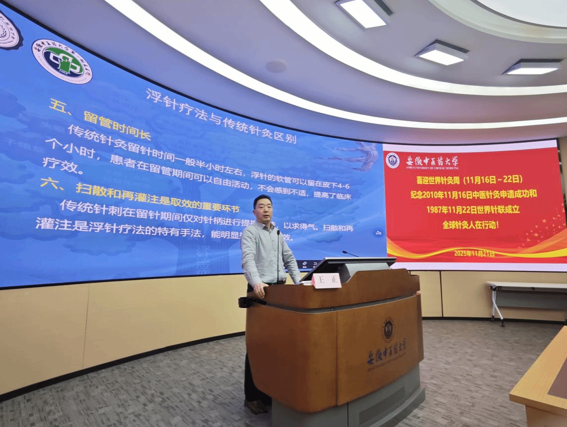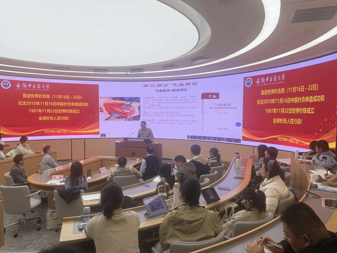 为迎接“世界针灸周”,弘扬针灸文化,11月21日,安徽中医药大学针灸推拿学院(康复医学院)精心策划的“华佗大讲堂”系列学术活动在少荃湖校区隆重举行。本次活动以“传承·融合·创新”为主题,将经典导引的千年智慧与浮针医学的现代创新熔于一炉,为师生呈现了一场精彩纷呈的学术盛宴。学术活动由学院党委书记唐巍主持,学院教师、“华佗菁英”班学子、各专业本科生、研究生参加会议。