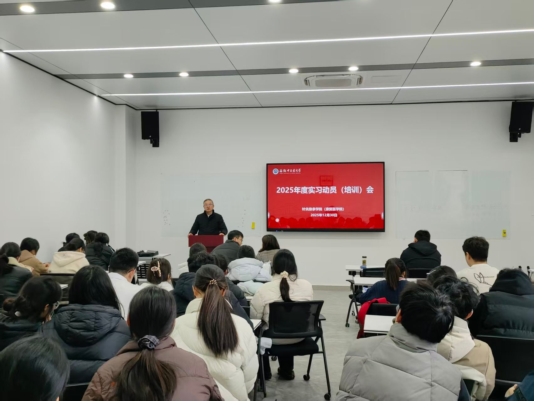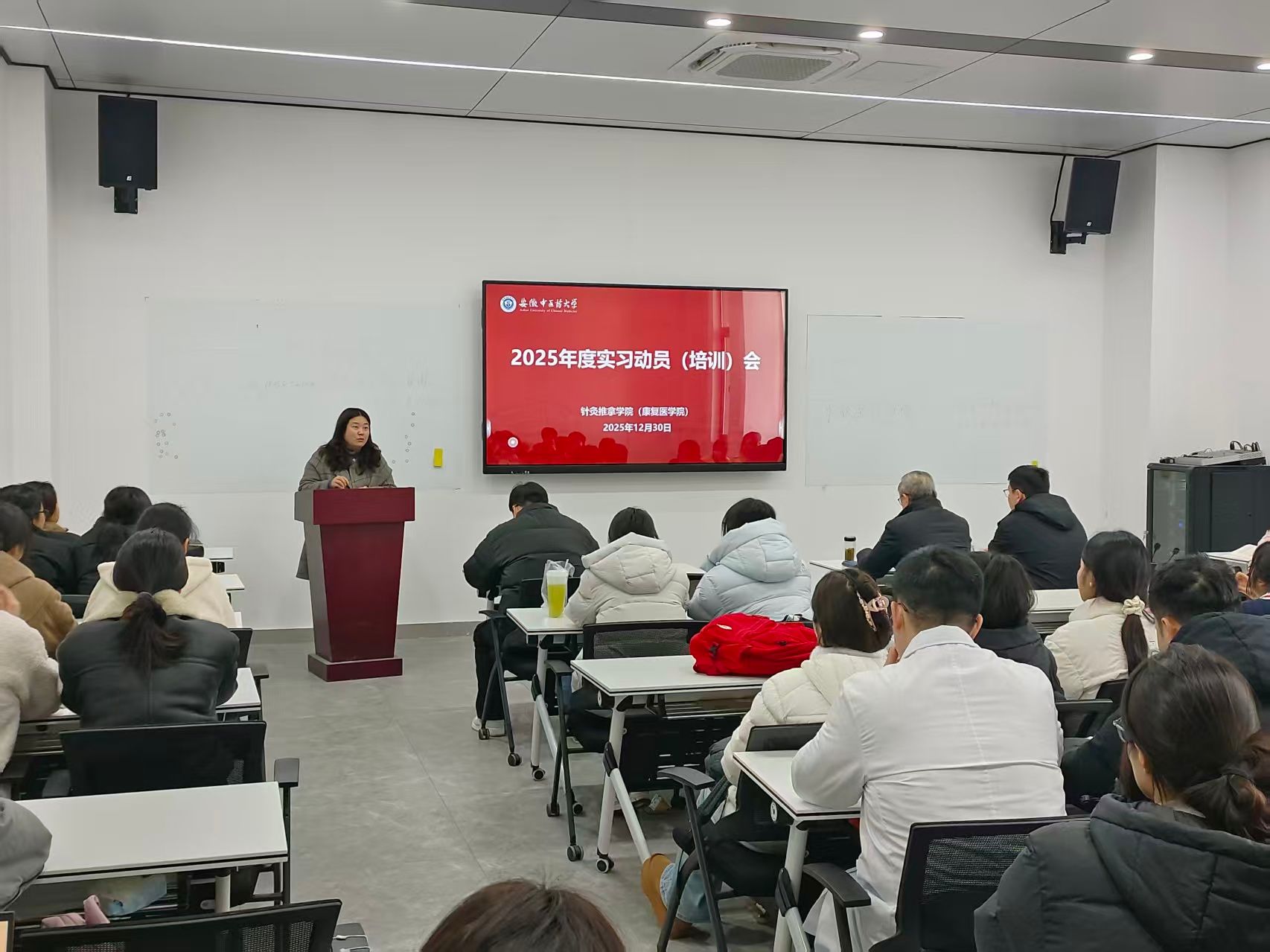 为进一步做好学院2025年毕业实习学生进岗工作,12月30日,针灸推拿学院(康复医学院)召开实习动员(培训)大会。学院委副书记李海燕参会并讲话,学院康复养生系教师代表、实习与就业办公室负责人、实习班级辅导员及全体实习学生参会,会议由实习与就业办公室负责人金祥雨主持。