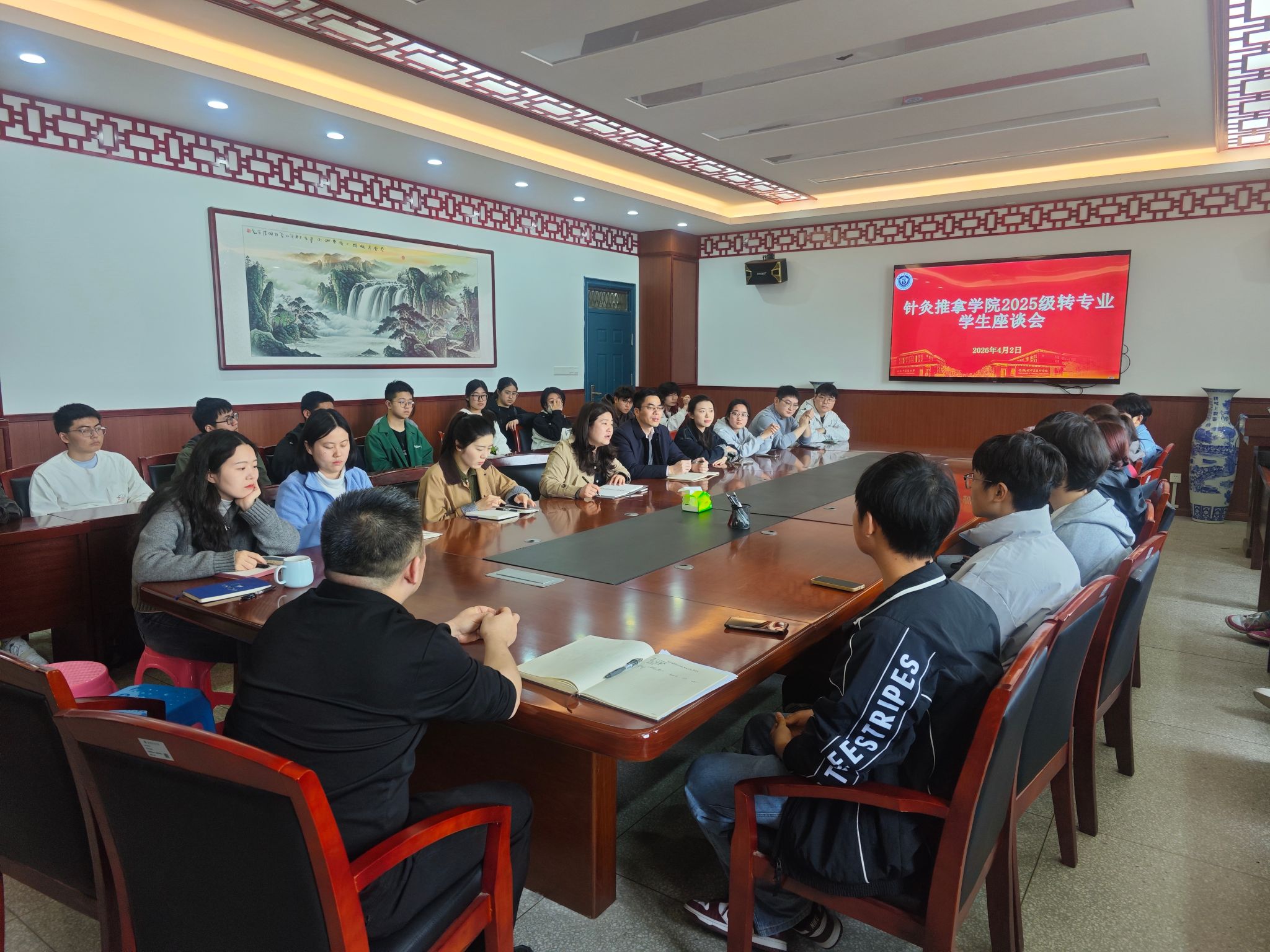 4月2日中午,针灸推拿学院召开2025级转专业学生座谈会,学院领导班子及新生辅导员出席会议,会议由学院党委副书记李海燕主持。