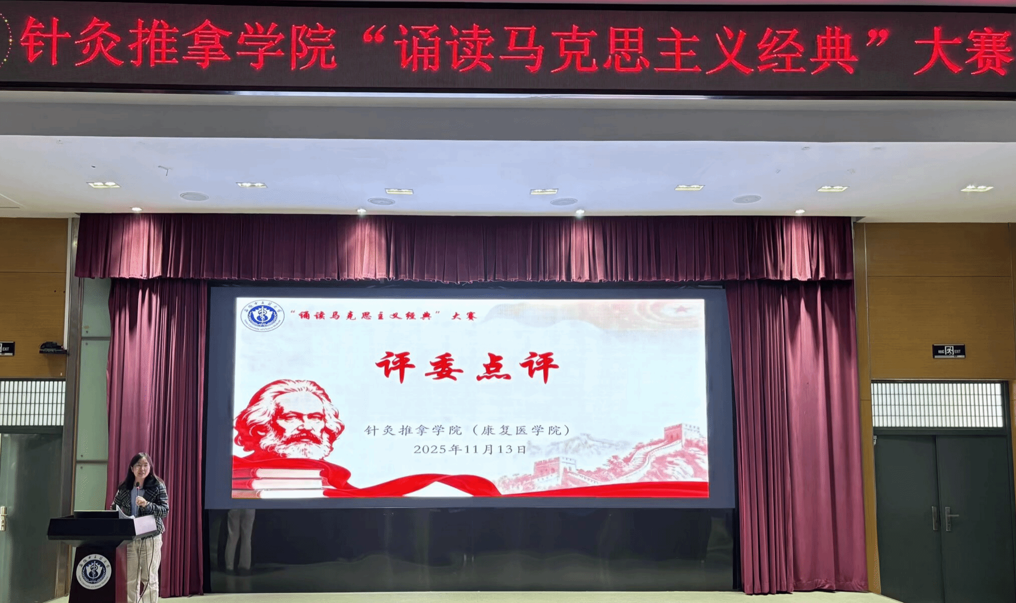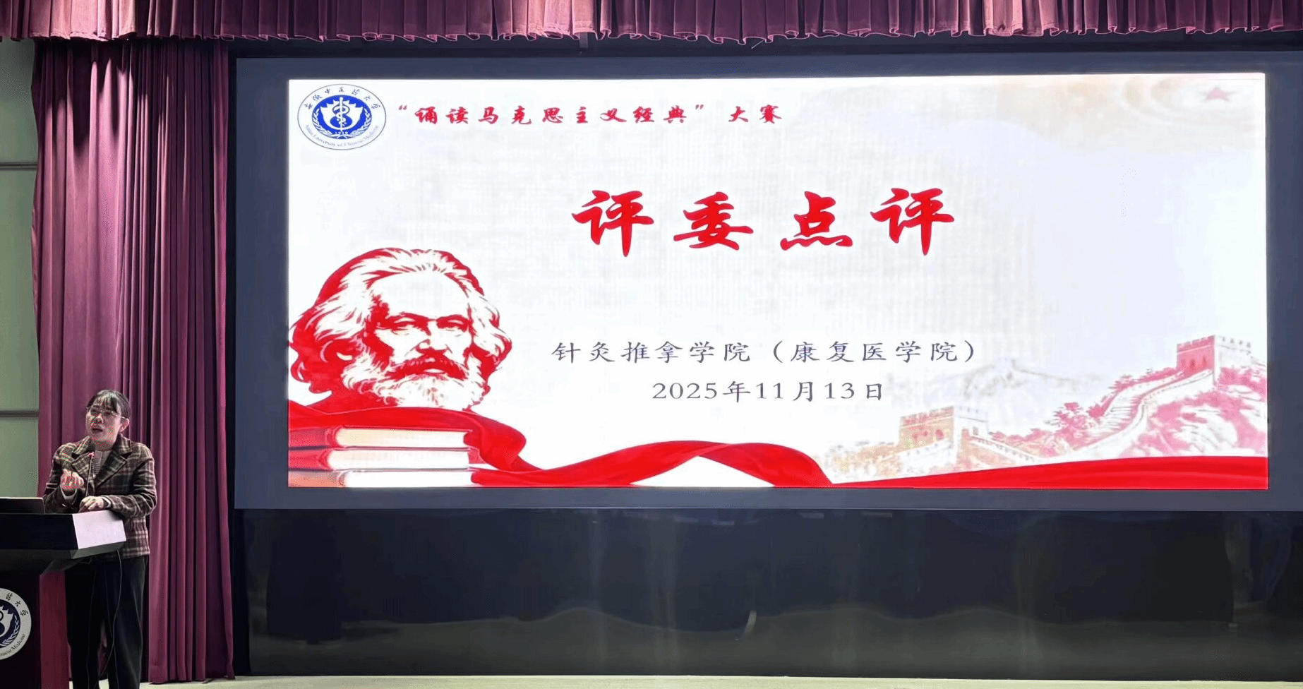 为深入学习贯彻党的二十届四中全会精神,全面领会习近平新时代中国特色社会主义思想的深刻内涵,积极引导学生品读马克思主义经典著作,汲取真理的磅礴力量,针灸推拿学院于11月13日举办第九届“诵读马克思主义经典”大赛。此次活动不仅是一场文化的盛宴,更是学院加强思想引领、培育时代新人的重要举措。针灸推拿学院党委书记唐巍、马克思主义学院教师陶春丽、学院党委副书记李海燕、副院长吴子建、辅导员代表、学生代表担任评委。