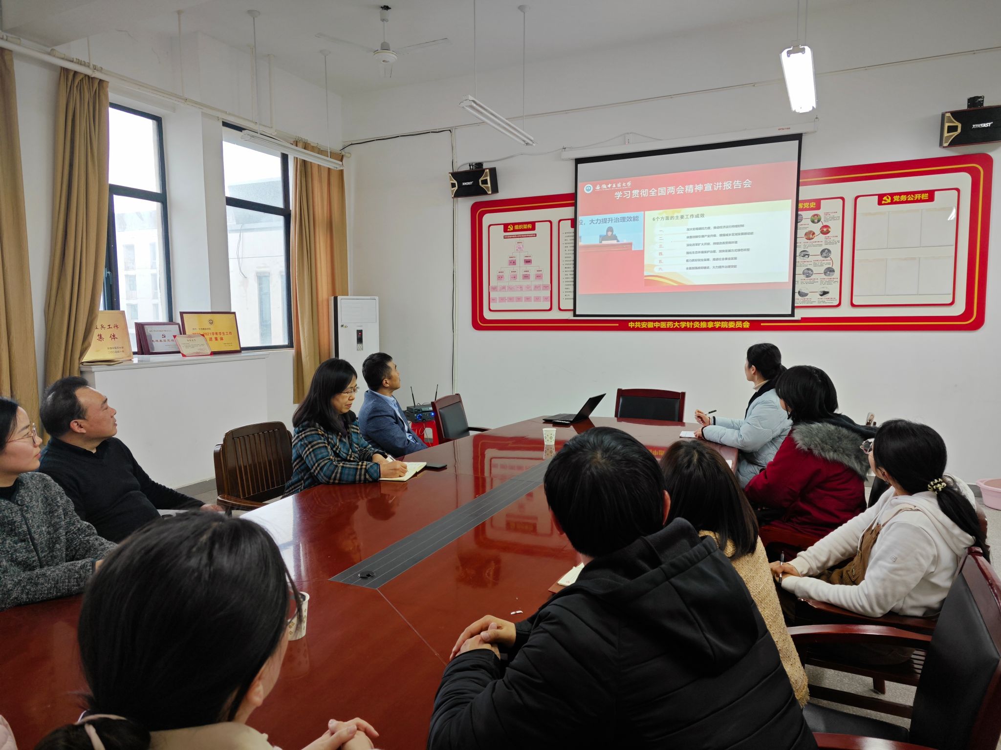 为深入学习宣传贯彻2024年全国两会精神,3月27日下午,针灸推拿学院全体师生通过线上线下相结合的形式聆听学习贯彻全国两会精神宣讲报告会,学院领导班子及部分教师于至精楼B9-A341会议室集中收看,辅导员及各班级思政委员于主会场观看,其余师生通过线上的方式自主收看。