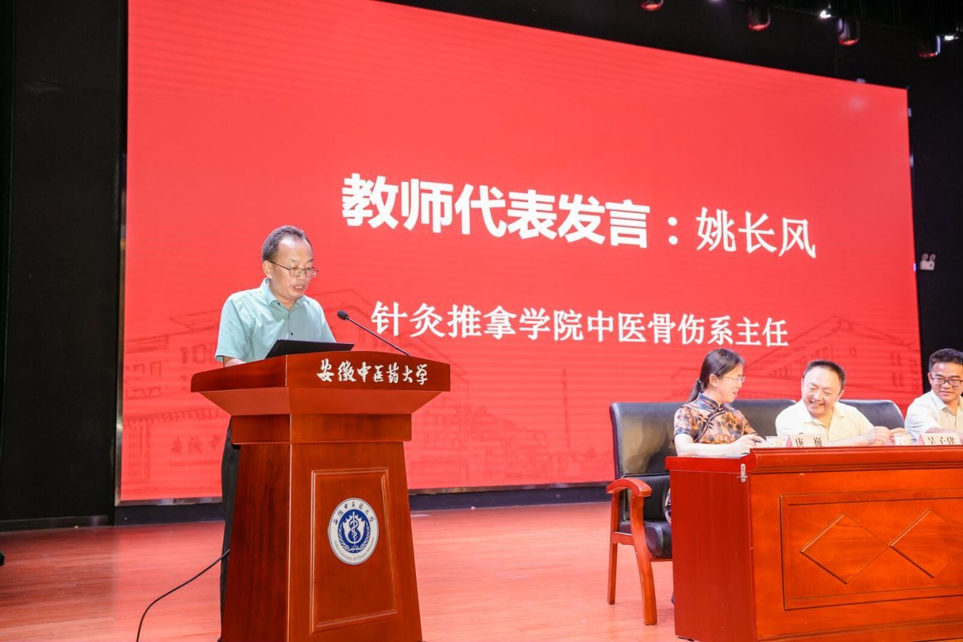 学院中医骨伤系主任姚长风作为教师代表发言,他希望学生们保持坚韧的学习姿态,同时要学会坚强,积极参加社会实践活动,常与身边的老师沟通,处理好人际关系。祝愿同学们在即将开始的大学生活中,不忘初心,奋发向上,收获知识,收获友谊,收获属于自己的精彩未来。