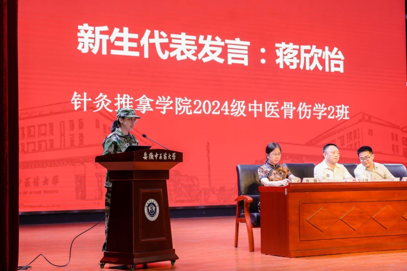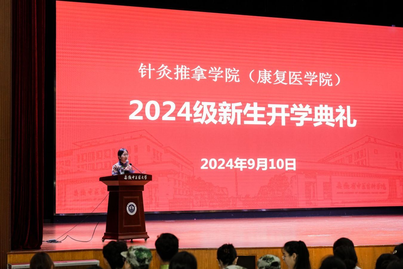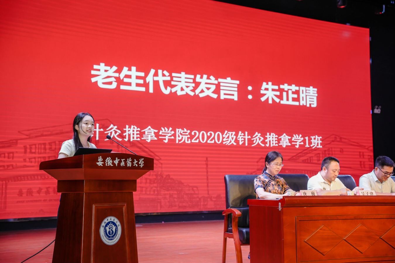 学院2020级针灸推拿学1班朱芷晴和2024级中医骨伤学2班蒋欣怡分别代表老生和新生发言,朝气蓬勃的他们,用充满激情的语调向全体新生传递了积极向上的精神风貌。