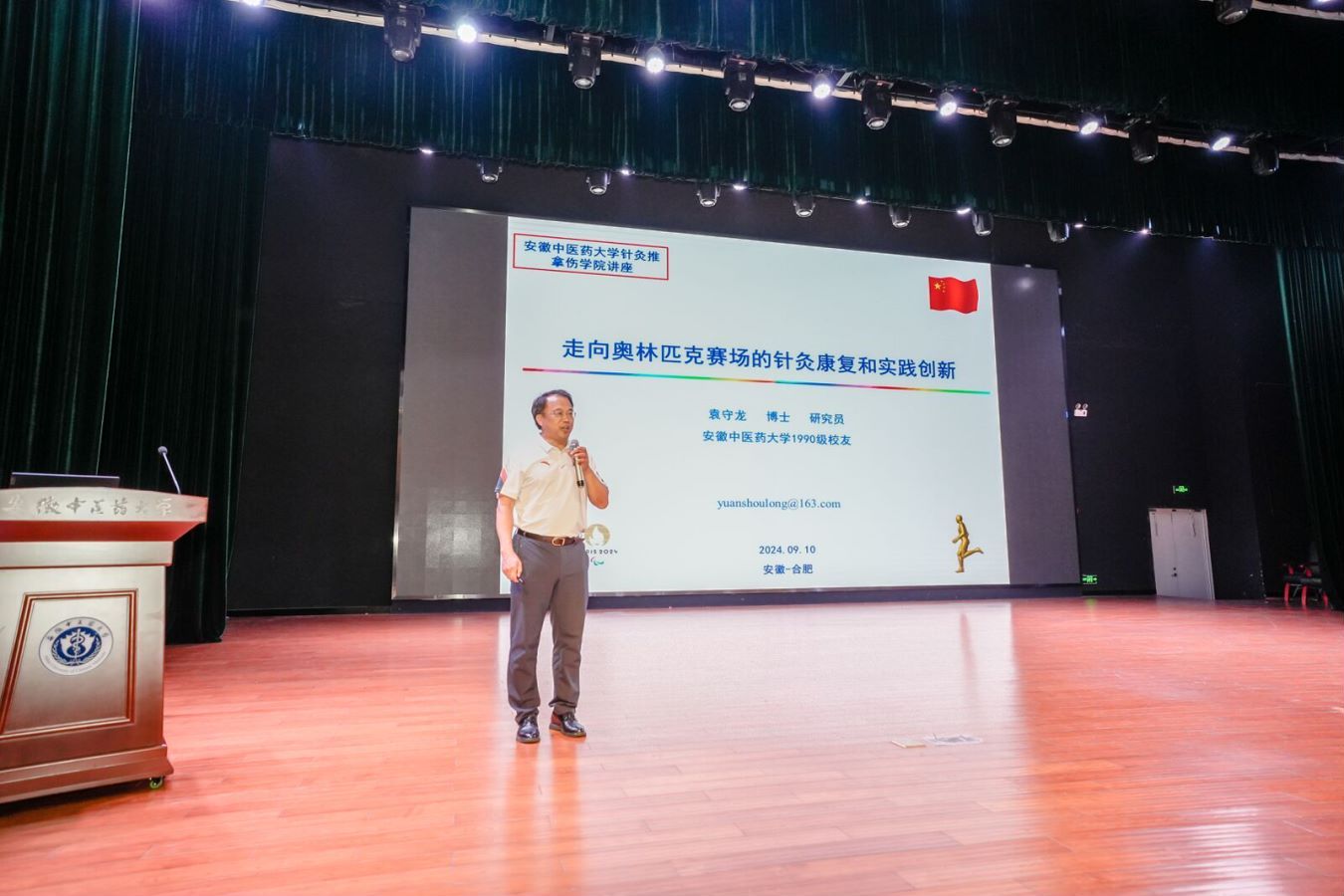 袁守龙为新生作《走向奥林匹克赛场的针灸康复和实践创新》的专题报告,鼓励同学们牢记习近平总书记嘱托,筑牢理想信念根基,锤炼过硬本领,努力成长为堪当时代重任的栋梁之才。他以第33届夏季奥林匹克运动会上中国奥运代表团取得的胜利故事为开篇,全面分享了针灸在奥林匹克赛场上运用的案例与感悟,从针灸治疗到体能康复训练等方面介绍针灸推拿、中医骨伤、中医康复、康复治疗学各专业在奥林匹克赛事中的独特优势,介绍了奥运会科技攻关理论探索和方法运用,同时对传统医学与主动健康提出思考与建议。他说:“中医针灸和其他西医的基础理论是学习的基础,是实践的基石,是未来人生的法宝,专业不仅要钻研,还要拓展,守正创新到开拓创新才能有新发展”。他幽默生动的报告方式,赢得全场阵阵掌声,为全体学生奠定了专业自信,明晰了未来多种发展方向。