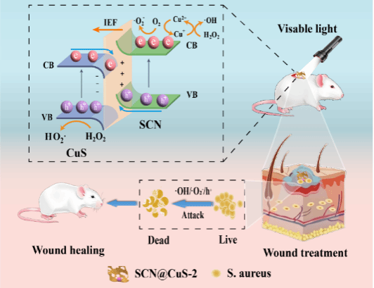 本研究通过制备S-scheme异质结(SCN@CuS),成功开发了一种具有快速、高效杀菌活性的光催化-类芬顿体系,并对其灭菌机理进行了深入探讨。先进的表征技术和理论计算结果表明,S-scheme异质结不仅促进了光生电荷的分离,而且优化了活性氧的生成,在抗菌活性中发挥了至关重要的作用。此外,该创新体系实现了铜的价态循环,加速了过氧化氢的活化,实现了光催化-类芬顿反应的协同灭菌。在体内外实验中,均表现出显著的灭菌效果。这项工作突出了光催化-类芬顿体系在灭活细菌领域的应用潜力。(林先刚 /文图 唐巍/审核)