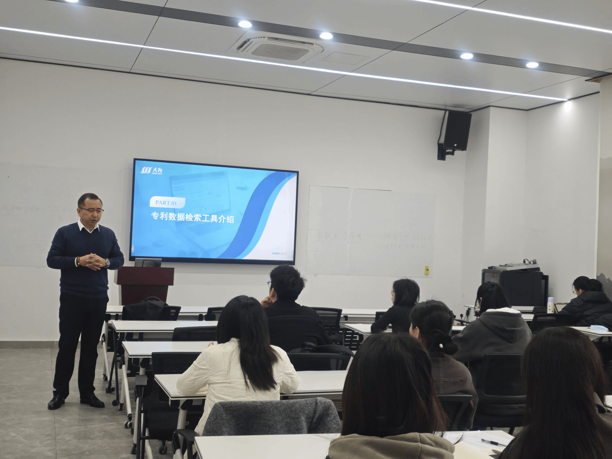 讲座邀请北京环宇合创科技有限公司项目总监、资深专利代理人杨磊主讲,围绕“大为专利检索系统功能介绍”“专利查新流程解析”“AI在专利检索中的应用”三大核心模块展开分享。杨磊老师首先系统讲解并现场演示了大为专利检索平台的核心功能与操作技巧,指导学生高效开展专利查询与分析;随后结合具体案例,解析专利查新的意义、流程及常见问题,助力学生掌握科研立项与成果申报中的有效检索及新颖性判断方法;最后聚焦人工智能在专利领域的前沿应用,详解智能检索、语义分析等技术对检索精度与效率的提升作用,为中医药专利挖掘提供了新思路。