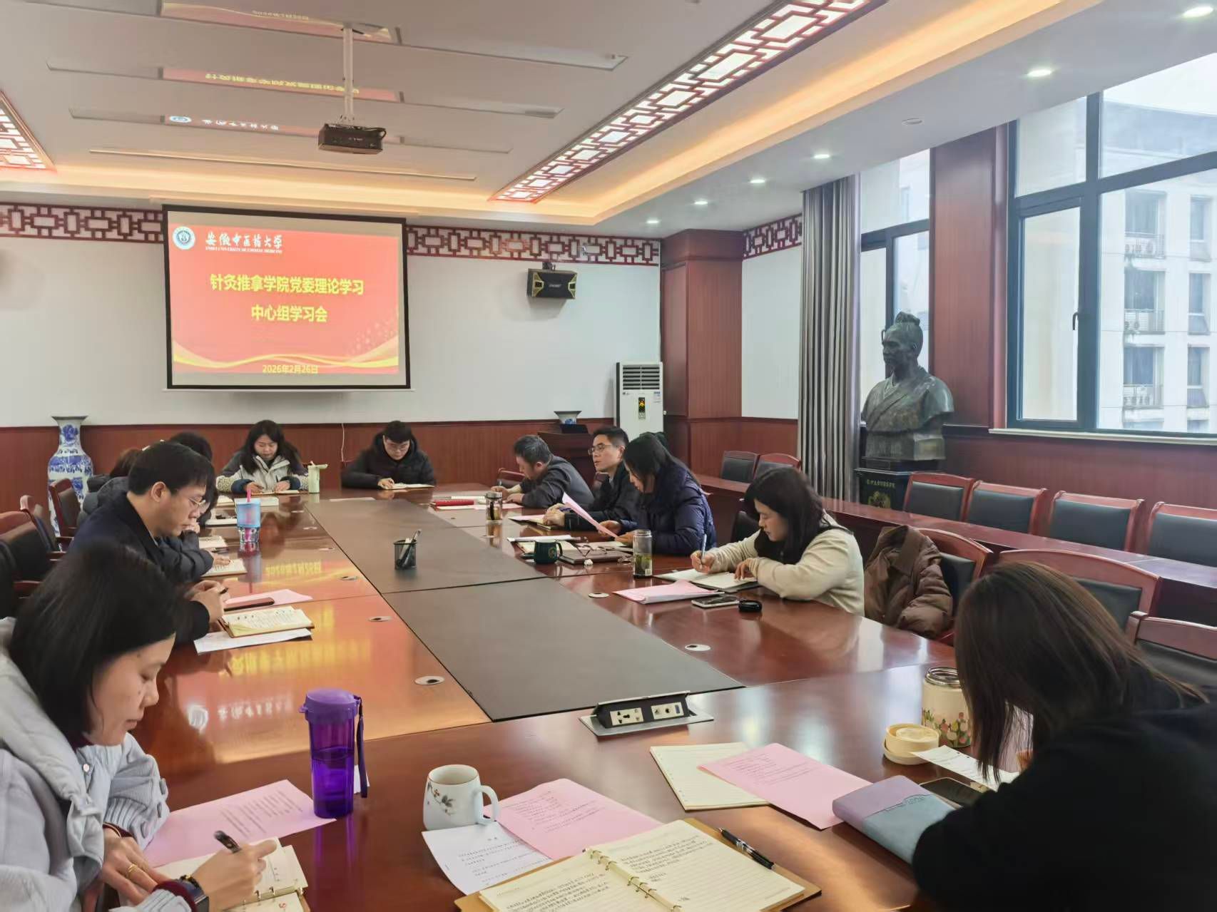 2月26日上午,针灸推拿学院召开2026年度第2次党委理论学习中心组(扩大)学习会,本次会议主题为“深学细悟党的创新理论,筑牢思想根基,以自我革命精神开好高质量民主生活会”。作为新学期开学后的第一次集中学习,学院党委高度重视,旨在以理论学习的再深化,推动全年工作开好局、起好步。学院党委书记唐巍主持会议,学院党委理论学习中心组成员、各党支部书记参加学习。