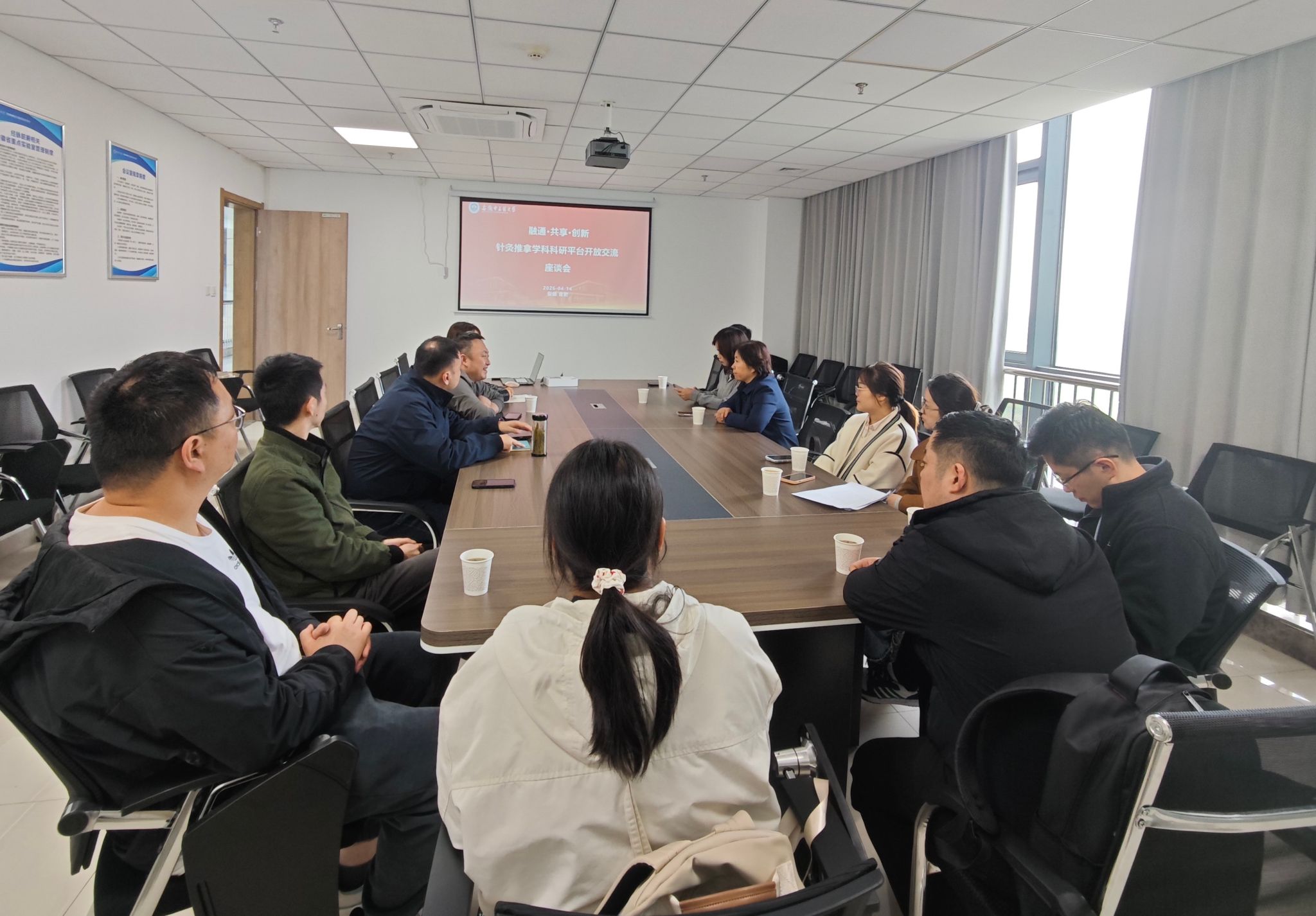 为深入推进针灸推拿学科科研平台建设,激发科研创新活力,4月14日下午,“融通·共享·创新——针灸推拿学科科研平台开放交流座谈会”在少荃湖科技园C区六楼举行。第二临床医学院副院长李梦、科研科科长张成、医院科研骨干代表、针灸推拿学院副院长吴子建、针灸推拿系主任崔帅、部分教师代表参会,会议由吴子建主持。