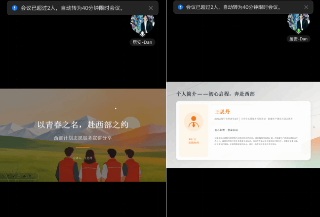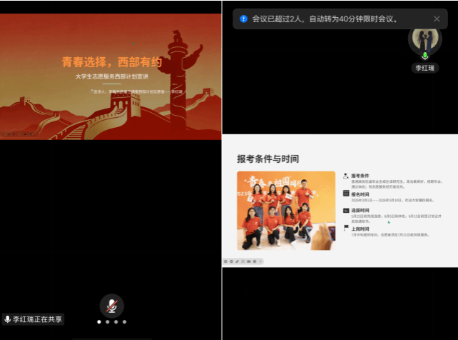 互动答疑解困惑,云端交流促成长。 2025届西部计划志愿者代表王思丹(现服务于新疆生产建设兵团十二师头屯河医院)总结了“适应环境、主动学习、扎根群众”的三大经验,讲述这一年志愿服务期间的事迹。参会学生提出的报名考试等问题,志愿者也逐一解答。同时,王思丹也补充了西部计划志愿者的考研加分、考公报考等优惠政策,鼓励大家积极报考西部计划。