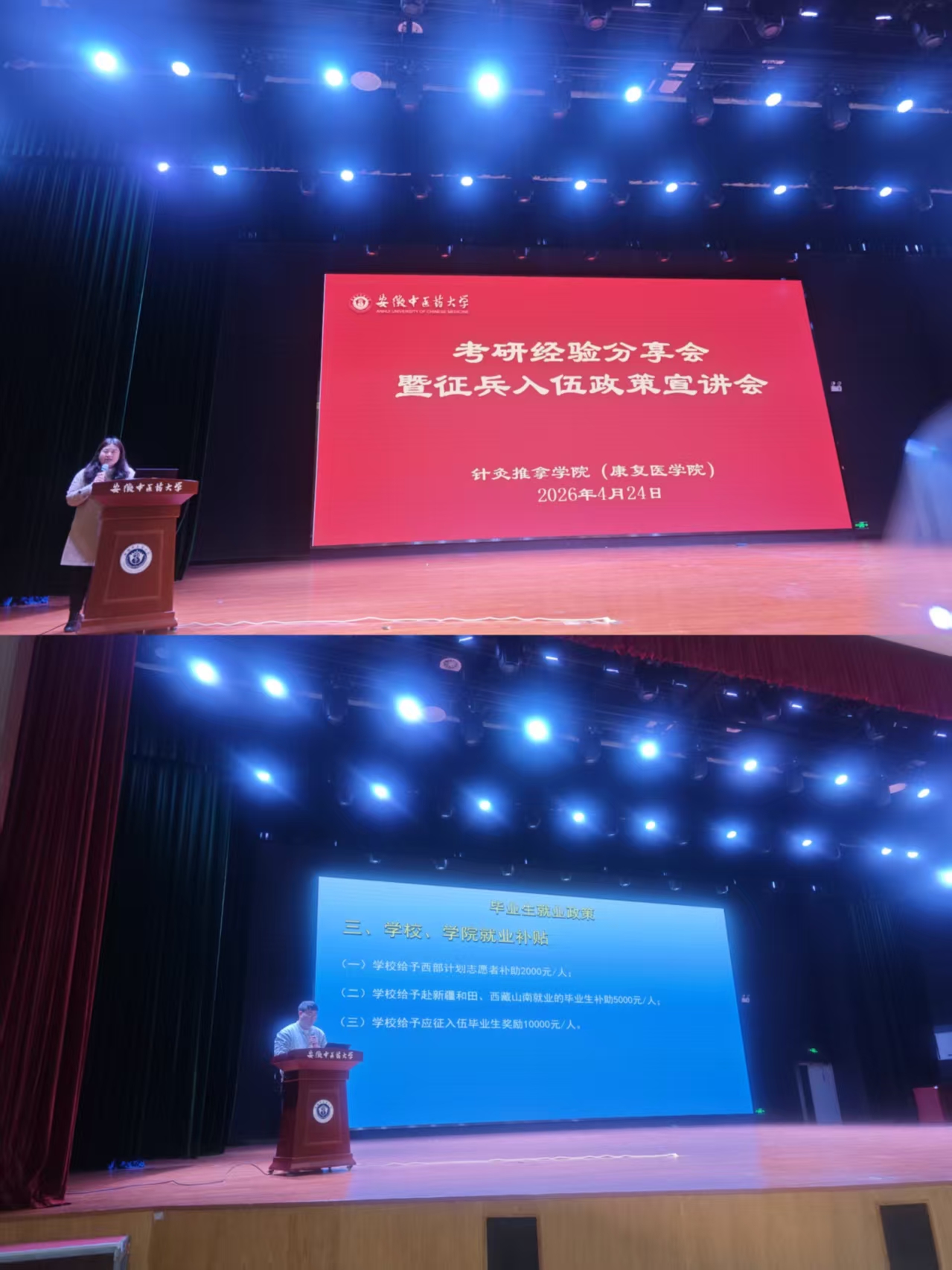 为助力学子精准规划考研备考路径、拓宽多元发展渠道,厚植青年家国强军情怀,4月24日晚,针灸推拿学院考研经验分享讲座暨征兵入伍政策宣讲会在大学生活动中心顺利举办。本次活动由学院党委副书记李海燕主持,辅导员和各年级学生到场参会。