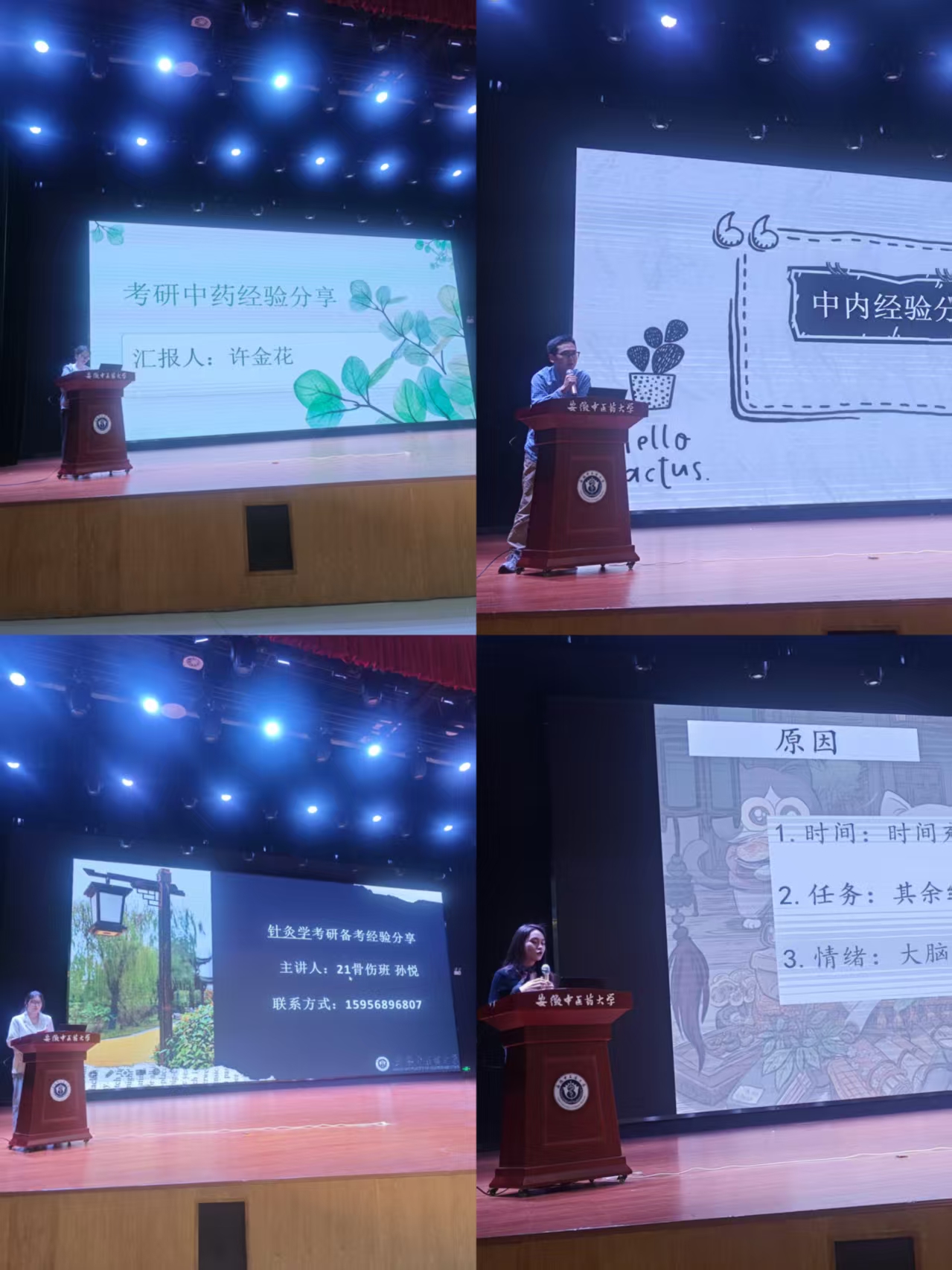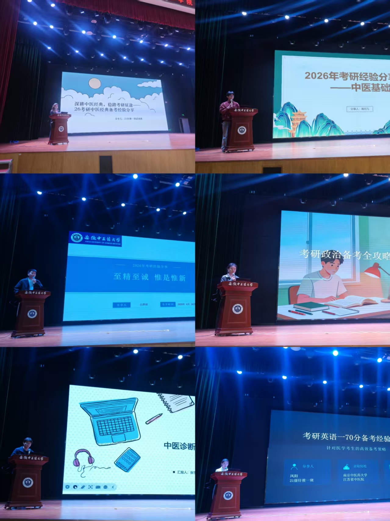 随后,学院2026届考研高分上岸学子代表依次分享备考经验。围绕中综考研全部必考科目,涵盖英语、政治公共课,中医基础理论、中医诊断学、中药学、方剂学、中医内科学、针灸学专业课,以及临床医学人文精神、中医经典等核心内容,学长学姐结合自身实战备考经历,简明扼要讲解基础夯实、重难点突破、刷题复盘、考点记忆和应试心态调节等实用方法,针对性解答低年级学子备考困惑,为备考学生理清复习思路、夯实备考基础提供切实指导。