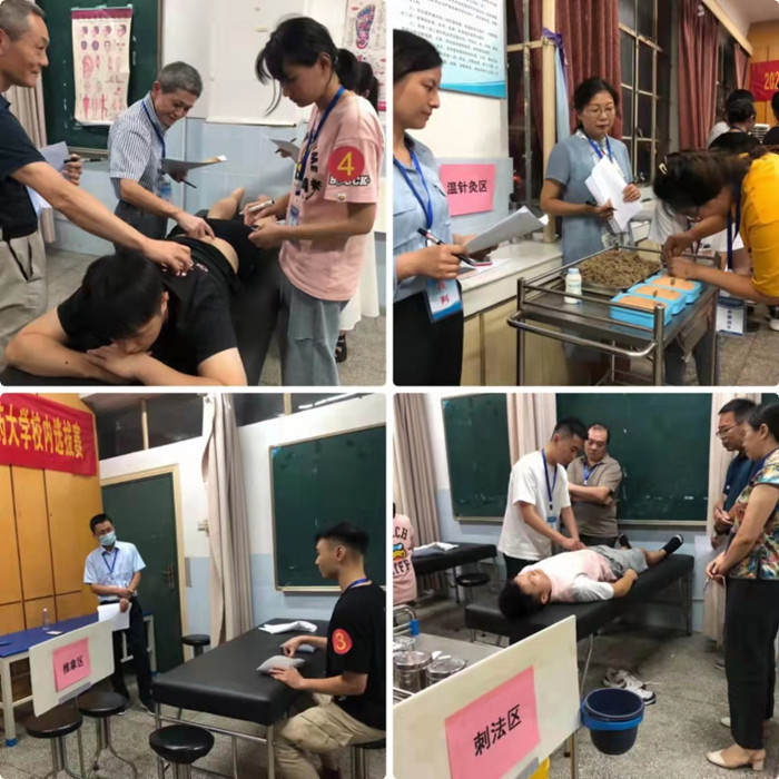暑期培训的12名同学参加本次选拔赛,按照抽签顺序,依次进行腧穴定位、刺灸法操作、温针灸和推拿手法等环节的比赛,最终选出吴杰等4名同学代表我校参加本次全国大赛。
