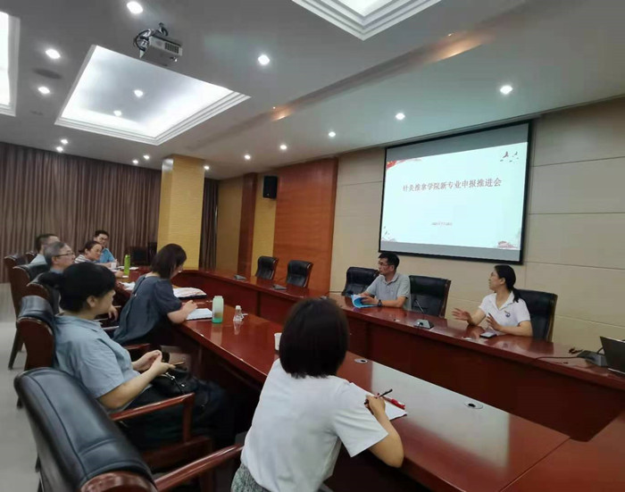 7月14日下午,针灸推拿学院在梅山路校区新安楼一楼会议室召开新专业申报推进会,该院党委书记蒋宏杰、院长唐巍、副院长刘自兵、系主任陈朝晖及康复养生系骨干教师参会。会议由唐巍主持。