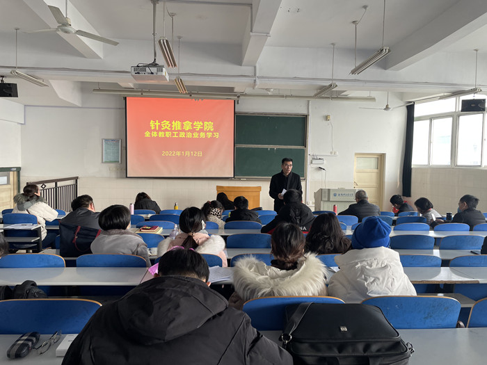 2022年1月12日上午,针灸推拿学院在梅山路校区新安楼阶梯教室401组织全体教职工开展政治业务学习,学院党政领导班子、全体教职工参加会议。