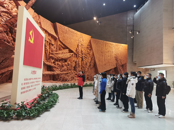 渡江战役纪念馆中,“百万雄师过大江”雕塑气势雄浑,震撼人心,再现了人民战争的伟大胜利,展现了党领导人民奋战的光辉历史。面向雕塑前党旗,支部党员、研究生入党积极分子庄严举起右拳,郑重宣誓,重温入党誓词。