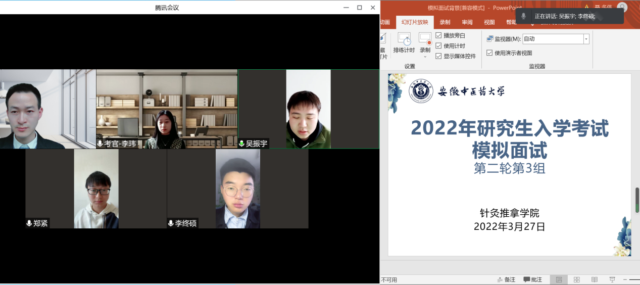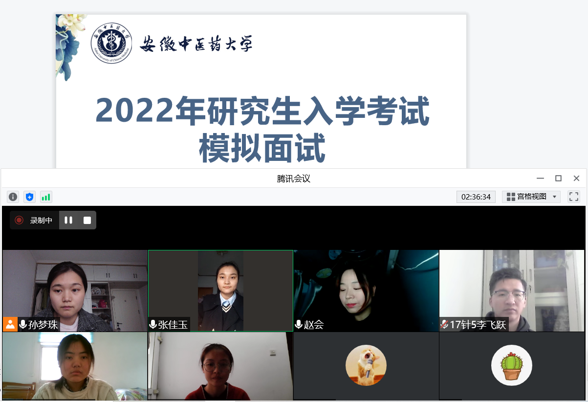 疫情期间,为帮助学院2022届考研毕业生提高线上复试的技巧和自信,3月26、27日下午,针灸推拿学院开展线上模拟复试活动。学院党委副书记李海燕、副院长吴子建、毕业班辅导员、部分老师及9位2021届成功升学毕业生参加了此次活动。