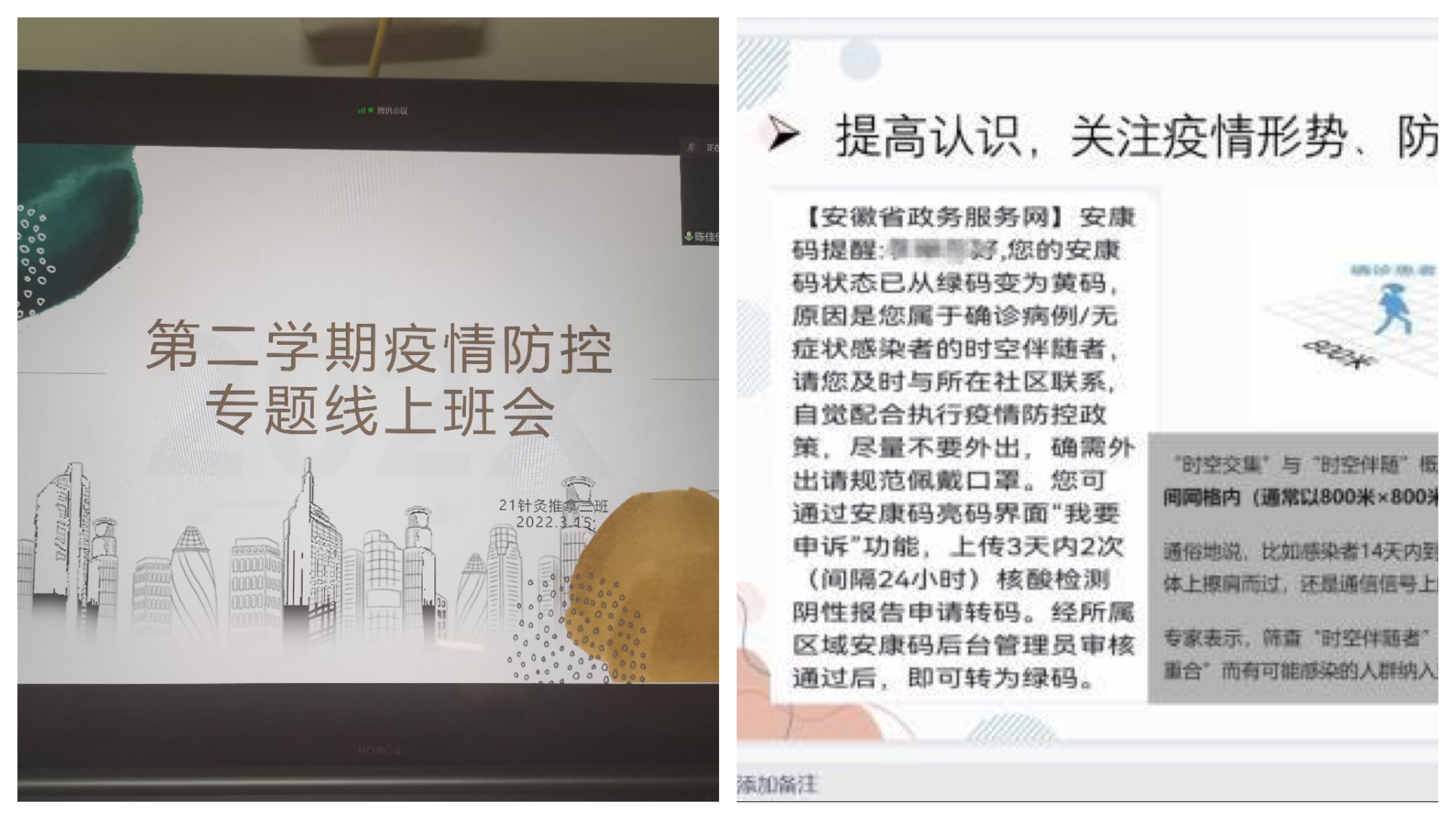 开好主题班会,做科学防控的宣传员。辅导员们立足各年级学生特点和工作重点,通过线上、线下主题班会向学生系统传达了学校疫情防控的工作部署和要求,宣讲了疫情防控措施与知识,要求大家增强责任意识和防护意识,同时也加强对学生的心理关怀,引导大家用积极的心态面对疫情,养成良好的卫生习惯,共同为疫情防控助力。