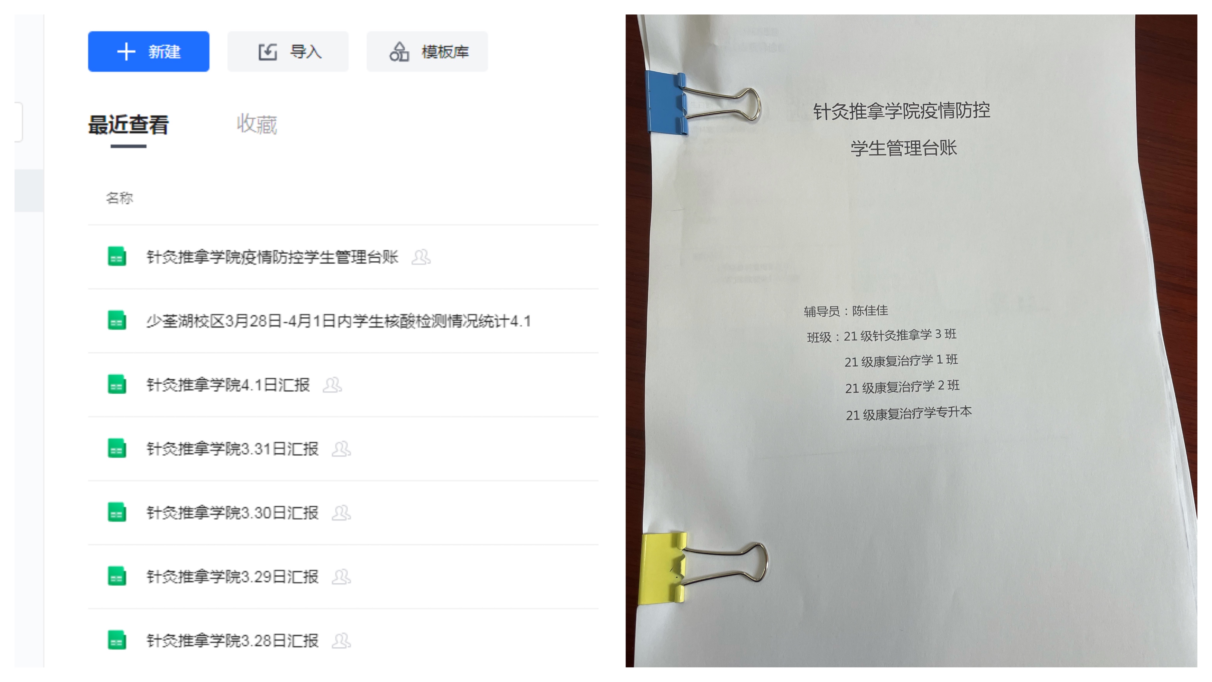 建立防疫台账,做精准防控的记录员。为了扎实履行疫情防控主体责任,保证疫情监测、排查、预警、防控等工作不落一人,针灸推拿学院建立了《疫情防控学生管理台账》,涵盖学生请假信息、安康码异常学生信息、离肥返肥登记信息、发热咳嗽等症状处理跟进信息等,同时每日督促学生通过“易班”进行体温监测,完善“日汇报”登记,提高疫情防控的精准性和有效性。