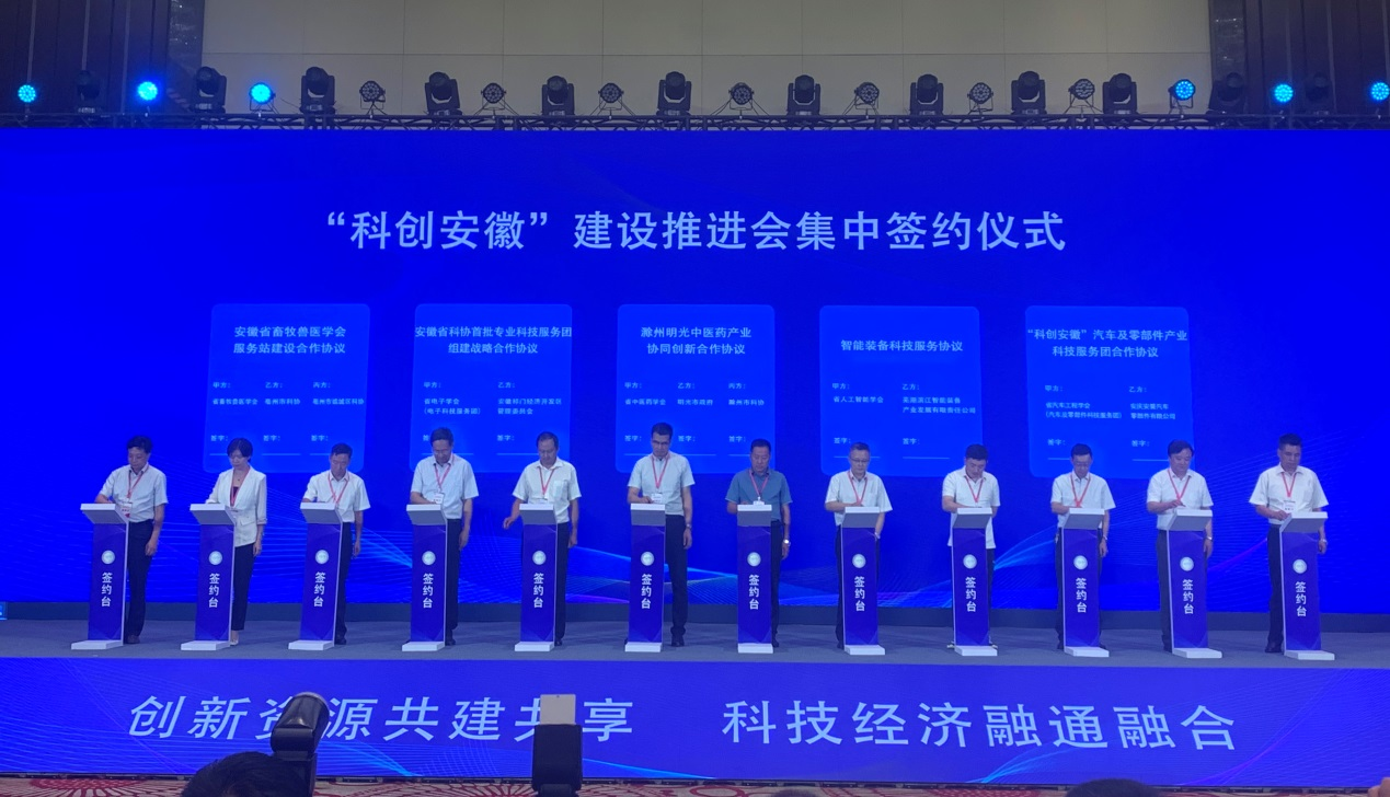 在当日下午举办的长三角“科创中国”服务科技经济融合发展论坛上,举行了“科创安徽”建设推进会集中签约仪式,针灸推拿学院党委书记蒋宏杰代表安徽省中医药学会与滁州市科学技术协会、明光市政府签署中医药协同创新合作协议。