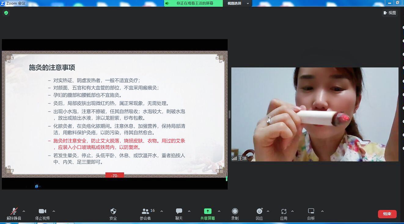 随后,教工第一党支部王洁老师开展以“灸助健康---浅谈艾灸养生”为题的讲座,王洁从灸法的起源、概念、分类及应用以及夏季艾灸养生等四个方面展开讲解,结合教具展示、视频操作详细演示艾灸的操作方法,并结合具体案例分析夏季艾灸养生的方法及注意事项。孔子学院师生对艾灸养生表现出浓厚的学习兴趣,纷纷提问交流互动。
