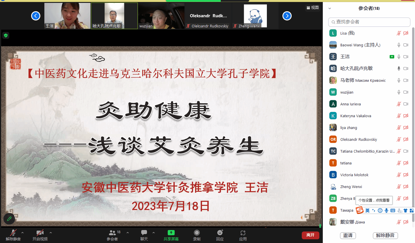 7月18日晚,针灸推拿学院教工第一党支部与乌克兰哈尔科夫国立大学孔子学院共同举办“中医药文化进校园”线上专题讲座活动,哈尔科夫国立大学孔子学院外方院长达尼亚,中方院长卢兆敏,针灸推拿学院副院长、教工第一党支部书记吴子建参会,孔子学院教师代表以及汉语班学员通过Zoom共同参与。会议由孔子学院汉语教师、安徽中医药大学校友王宝卫主持。