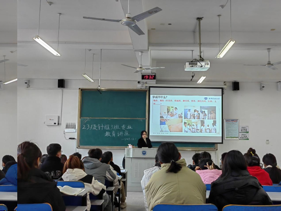 为贯彻落实《安徽中医药大学本科生班主任工作管理办法》,明确大学学习目标和生活方向,增强2023级新生对专业认识,12月1日下午在少荃湖校区A312举办2023级针灸推拿学3班专业思想教育讲座,本次讲座由班主任左海燕主讲,辅导员陈佳佳主持。
