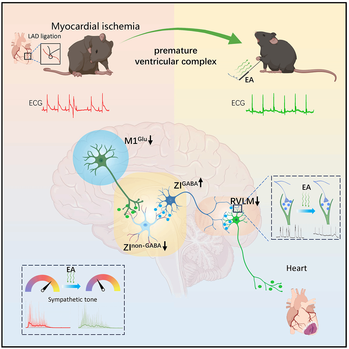 该研究主要发现手少阴心经“神门穴”与心脏在大脑中存在联系的“桥梁”,团队利用病毒神经示踪和光/化学遗传等技术,发现从大脑初级运动皮层(M1L5)经中脑未定带(ZI)至延髓头端腹外侧区(RVLM)的神经环路,在电针神门穴降低心肌梗死小鼠心律失常及室性心动过速中发挥关键作用,这为针刺神门穴治疗心肌缺血后心律失常提供了理论依据及中枢干预靶点。